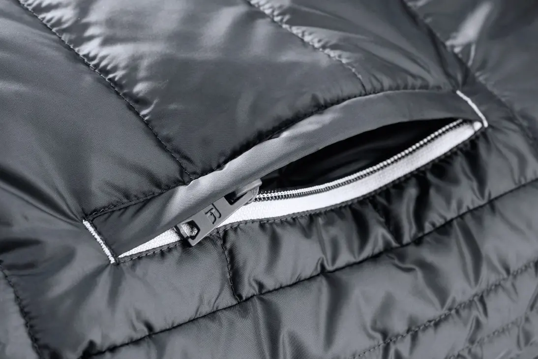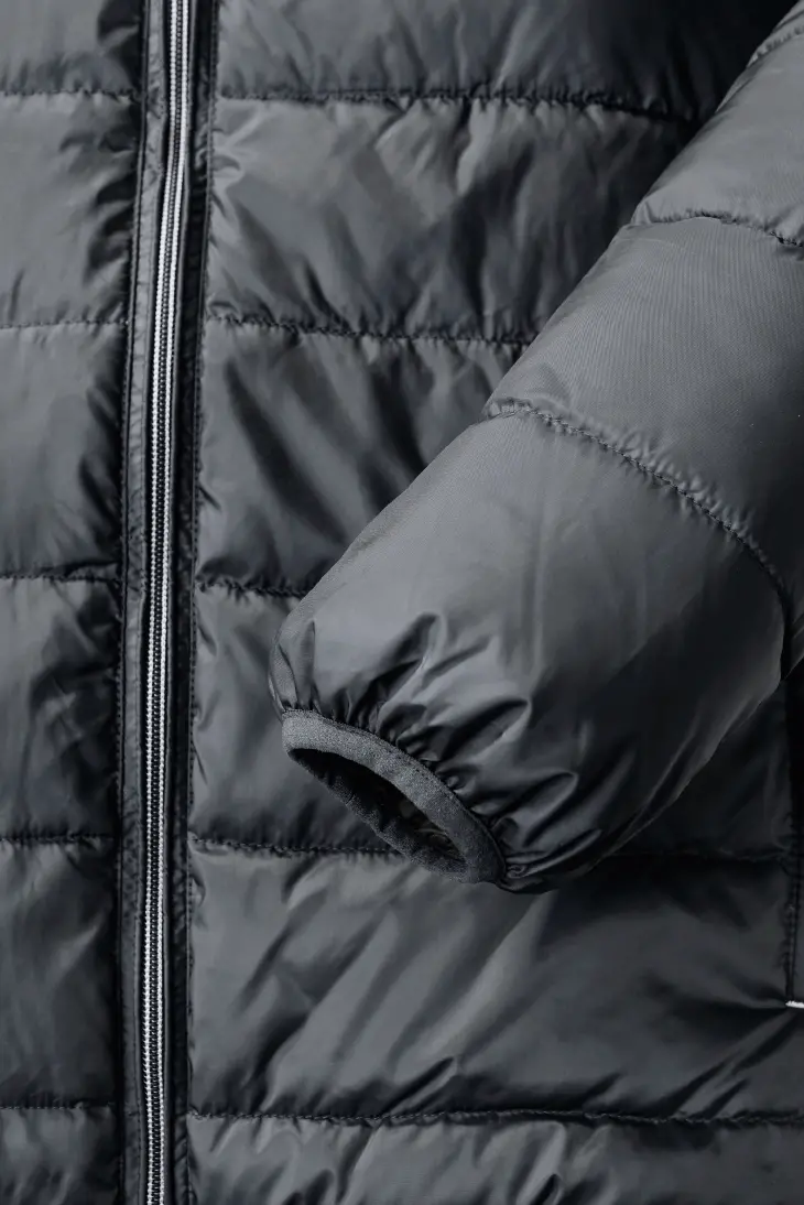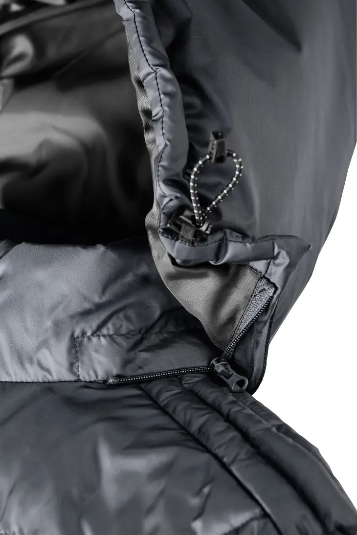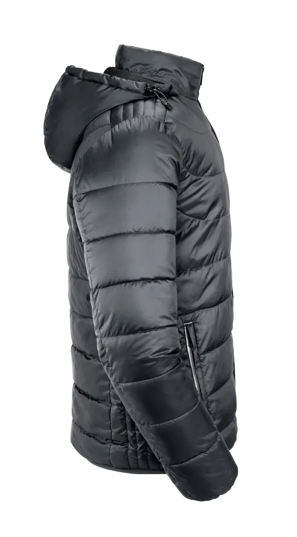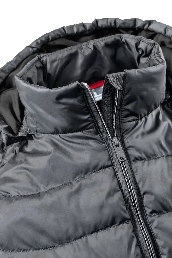 High performance DWR fabric treated with Aquapel™ by Nanotex® - Fluorine and PFC free - Eco-efficient padding by Dupont™ Sorona® - Stand up collar with chin guard and inner storm flap to ward off wind and draught - Contrasting zips, lining and accents for a refined look - 2 side pockets and 1 zipped inside pocket - Stretch binding at sleeves and hem - Adjustable 3-parted removable hood - Discreet decoration access at inner left ches7
