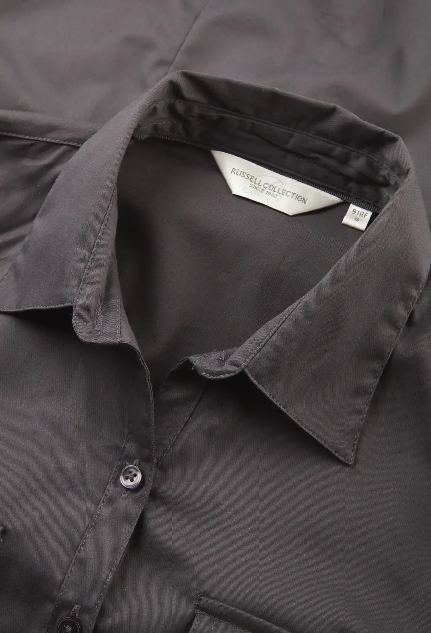 Modern fitted style with chest patch pockets with flap and button and fabric tab to fix rolled up sleeve