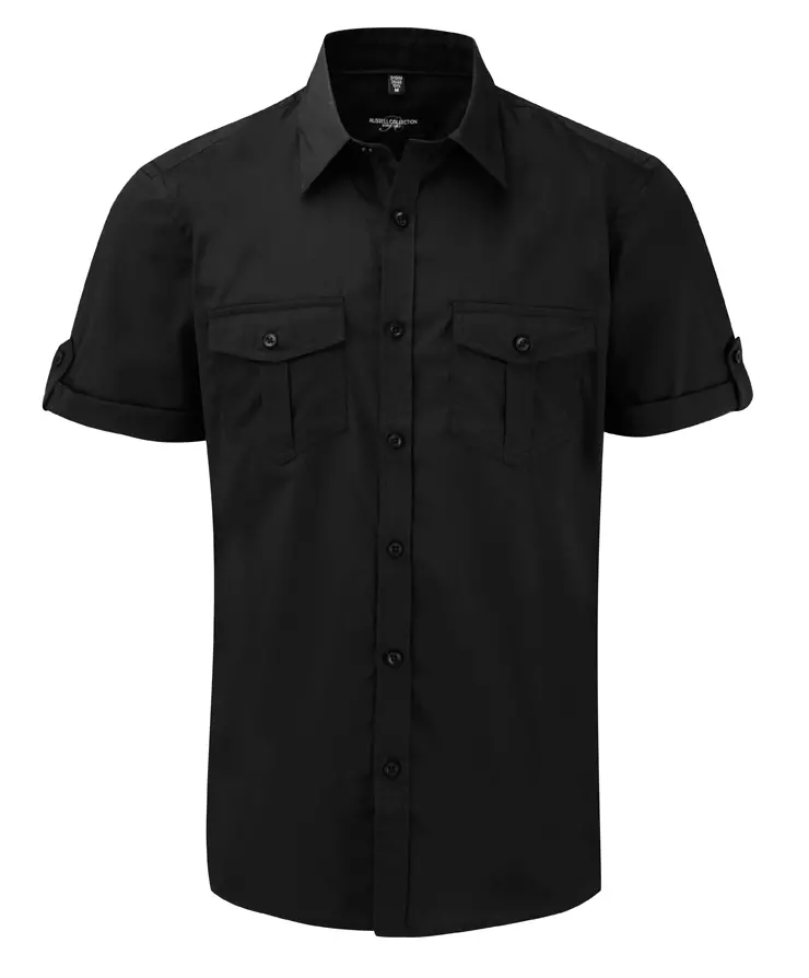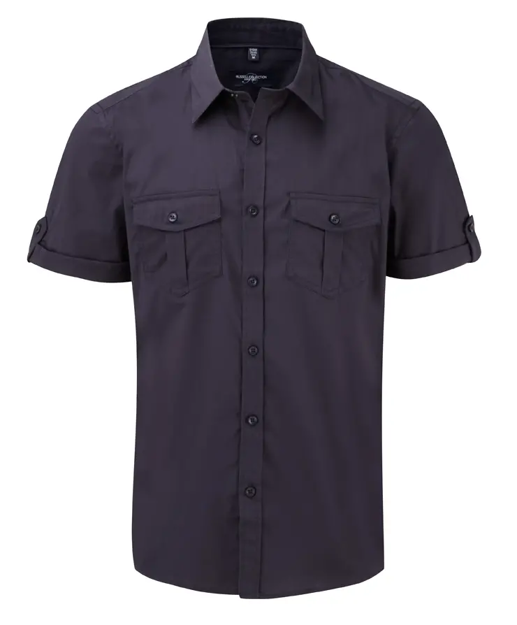 Modern fitted style with chest patch pockets with flap and button and fabric tab to fix rolled up sleeve