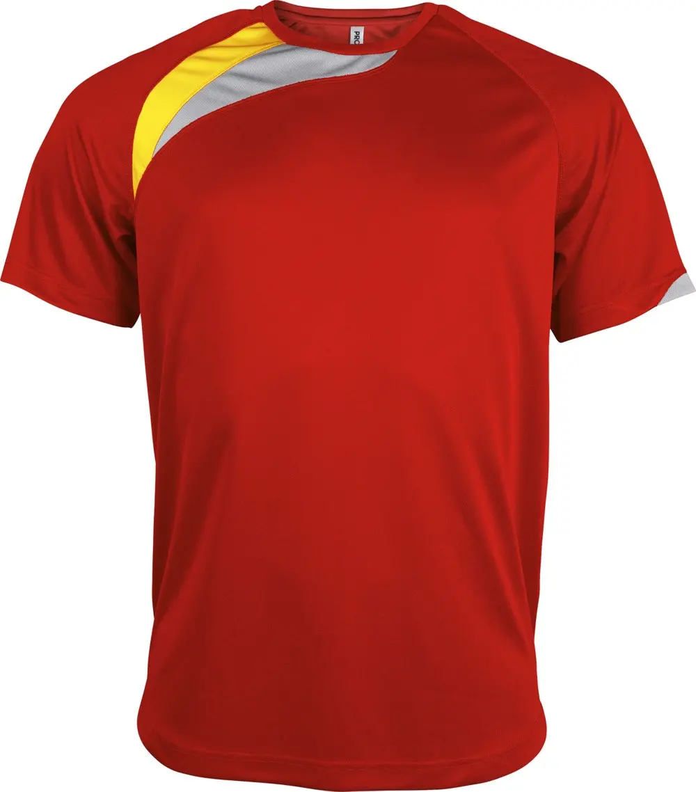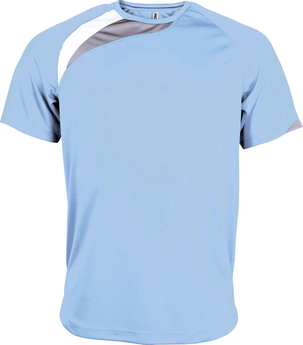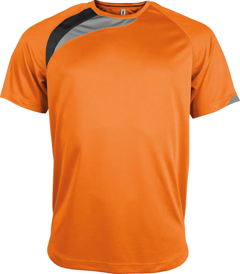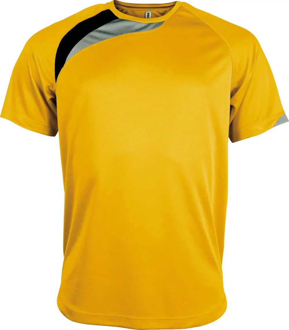 -100% polyester -Quick drying fabric -Contrast panels -Matching coverstitch finishing -Twin needle finishing.