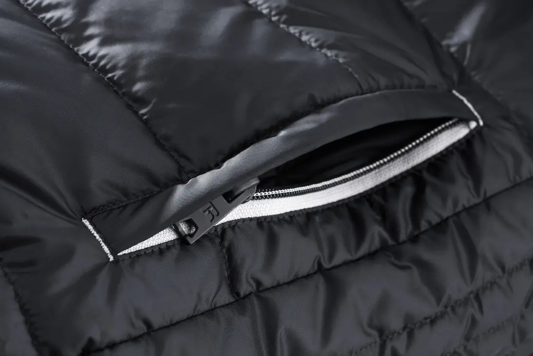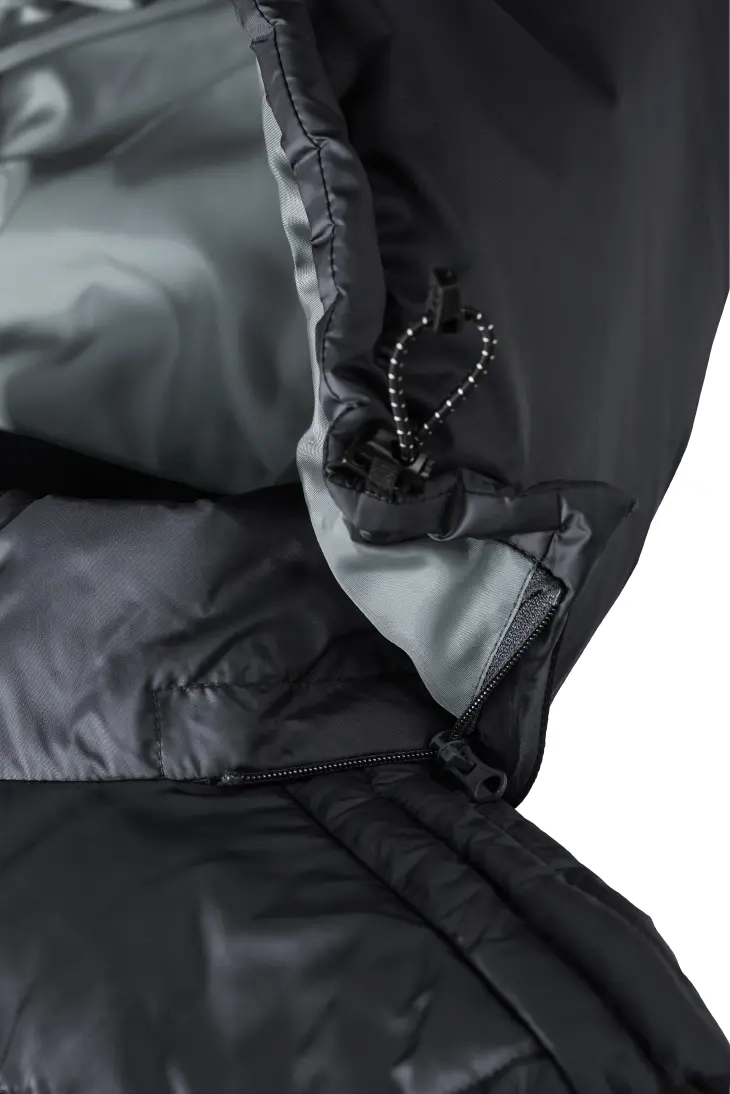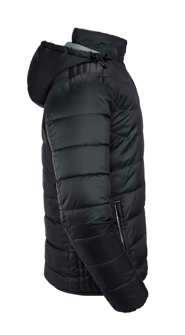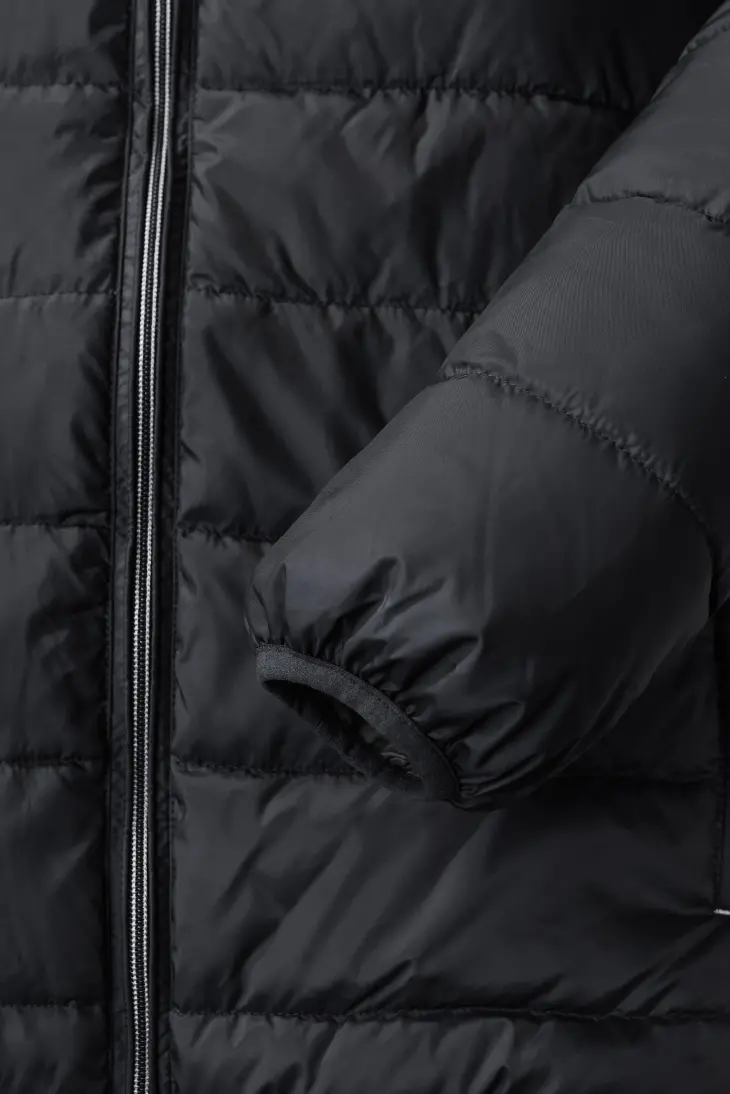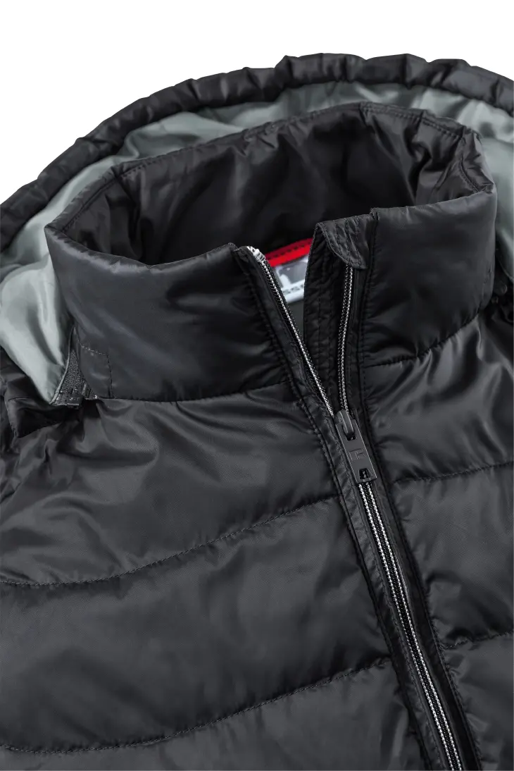 High performance DWR fabric treated with Aquapel™ by Nanotex® - Fluorine and PFC free - Eco-efficient padding by Dupont™ Sorona® - Stand up collar with chin guard and inner storm flap to ward off wind and draught - Contrasting zips, lining and accents for a refined look - 2 side pockets and 1 zipped inside pocket - Stretch binding at sleeves and hem - Adjustable 3-parted removable hood - Discreet decoration access at inner left ches7